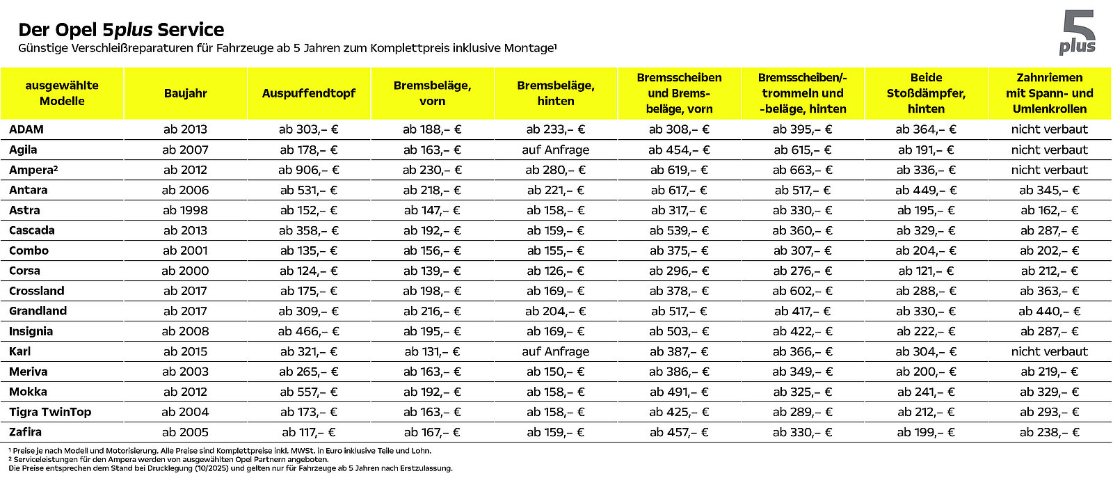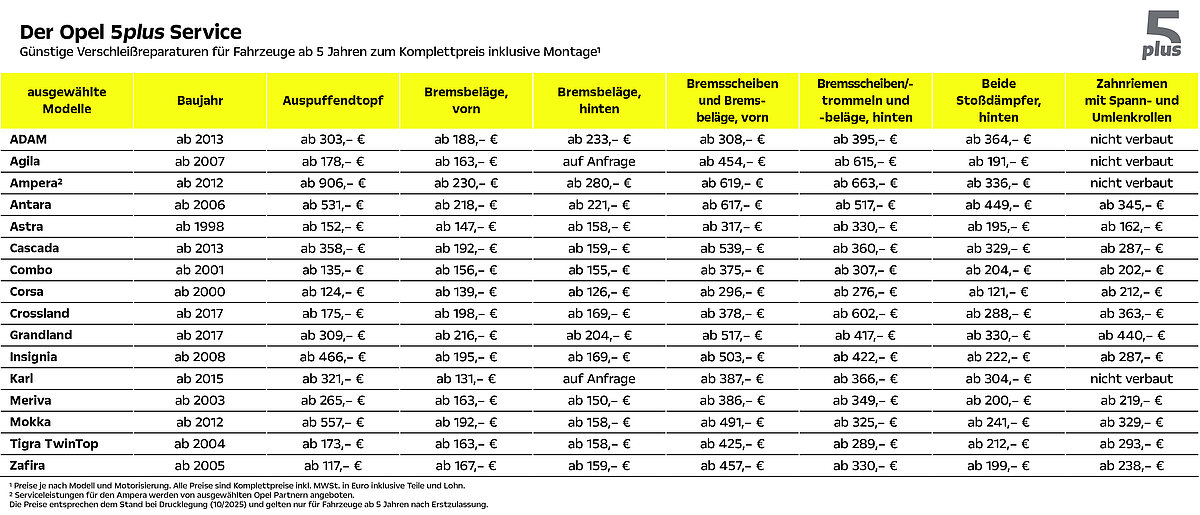 Wir bieten Ihnen mehr als 1.000 Verschleißreparaturen für viele Opel Pkw zu sensationellen Komplettpreisen inklusive Montage. Ob Sie einen zwanzig Jahre alten Opel Zafira oder einen jüngeren Opel Astra fahren, bei uns profitieren Sie von voller Kostenkontrolle, hoher Qualität durch OPEL Original Teile und supergünstigen Preisen.